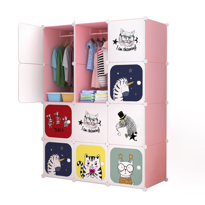 Dulap modulator cu 12 rafturi - Roz cu uși albe și model cu pisicuțe și zebre